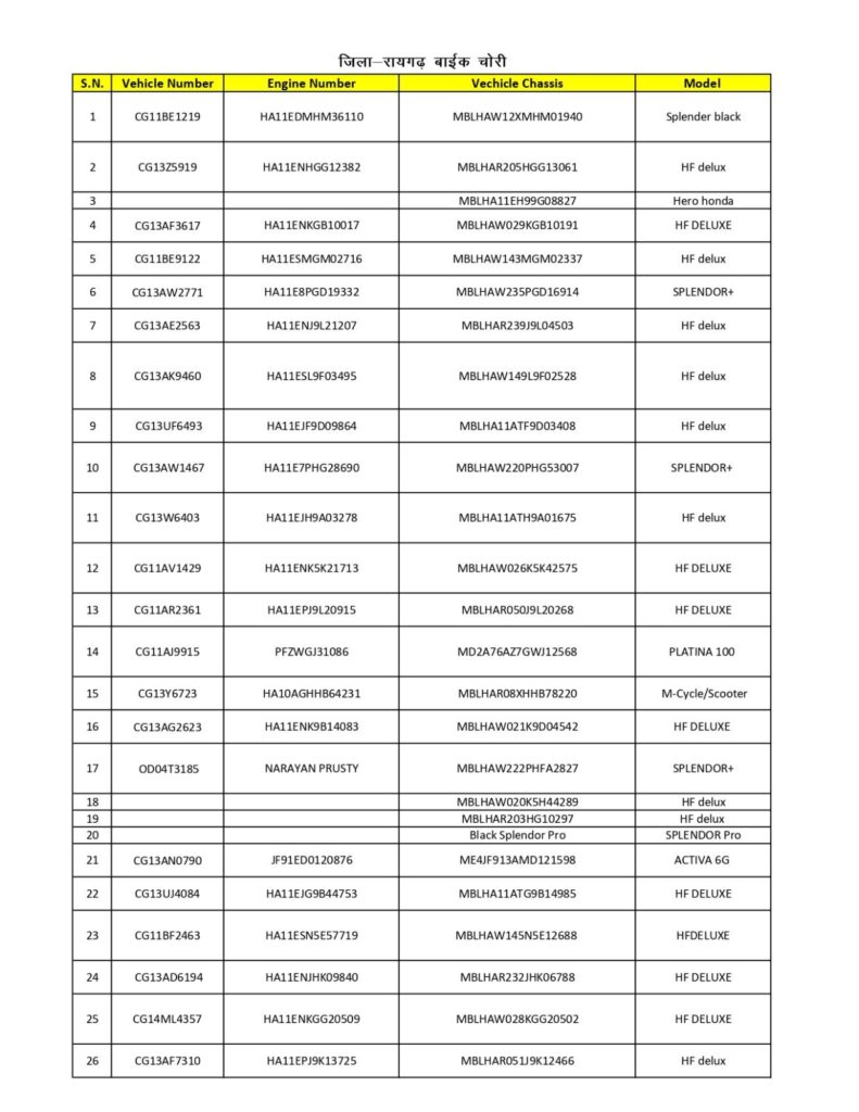प्रारंभिक जांच में बरामद बाइक में 21 बाइक पर रायगढ़ जिले में एफआईआर दर्ज मिले तथा 2 बाइक पर जिला सक्ती और एक चोरी बाइक में जिला सारंगढ़ में एफआईआर दर्ज है । आरोपी राजा खान का पूर्व आपराधिक रिकॉर्ड है जो चोरी के मामले में धरमजयगढ़ और बरमकेला गिरफ्तार हो चुका है आरोपी ने बताया कि वह आसानी से बिक्री होने वाली एचएफ डीलक्स स्प्लेंडर प्लैटिना बाइक चोरी में दिलचस्पी रखता था जिसे ये मास्टर की से लॉक खोलकर चुराया करता था ।