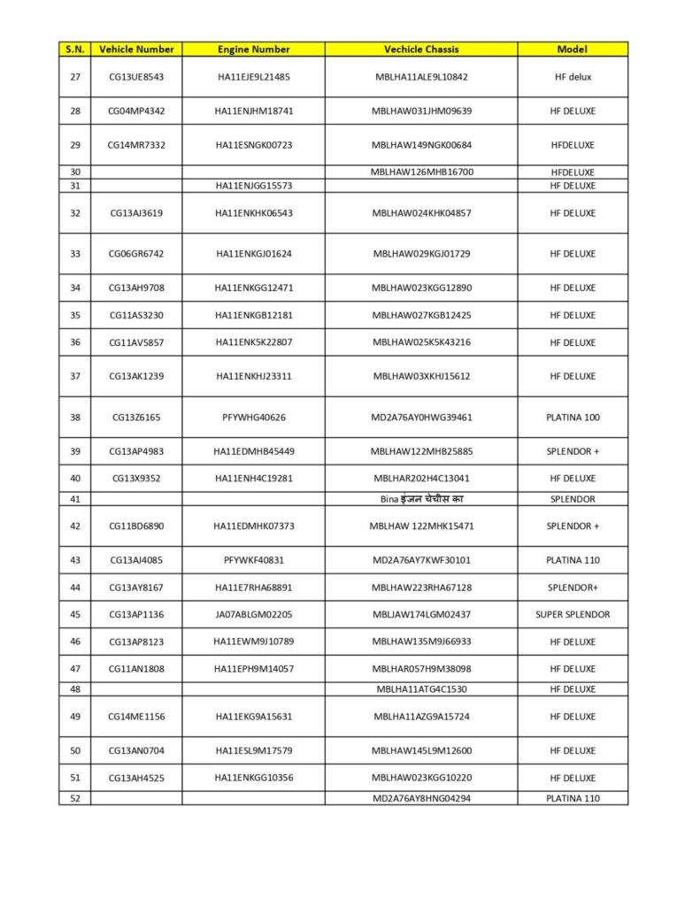 (38 एफएच डिलक्स बाइक, 9 स्पेलेण्डर, 4 प्लेटिना और 1 एक्टिवा 6G स्कुटी)
