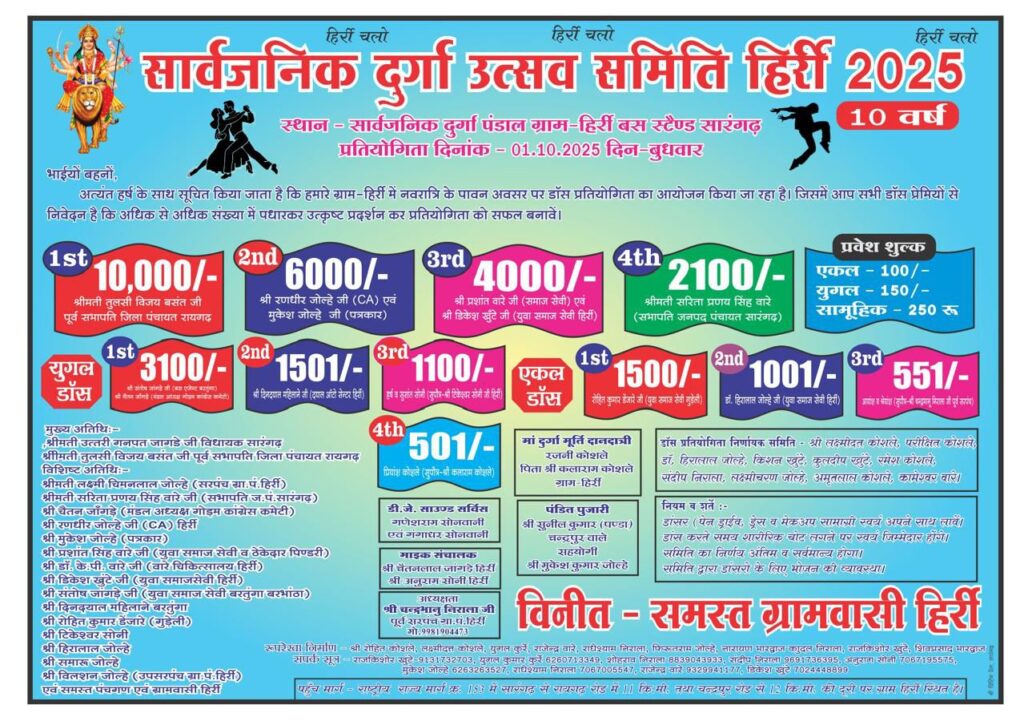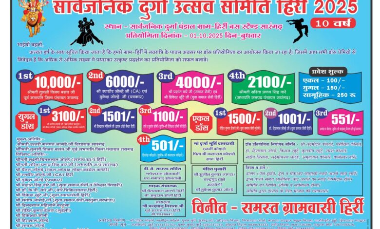 हिर्री। सार्वजनिक दुर्गा उत्सव समिति हिर्री के तत्वावधान में आज शाम गाँव में सांस्कृतिक माहौल रंगारंग होने जा रहा है। परंपरा और आधुनिकता के संगम से सजे इस अवसर पर भव्य डांस प्रतियोगिता का आयोजन किया जा रहा है। हर वर्ष की तरह इस बार भी ग्रामीणों और आस-पास के क्षेत्रों में प्रतियोगिता को लेकर जबरदस्त उत्साह देखने को मिल रहा है।